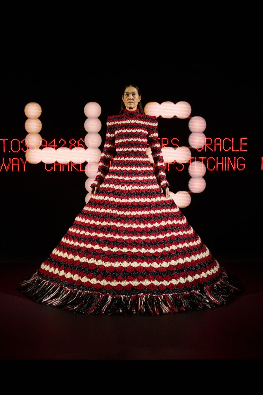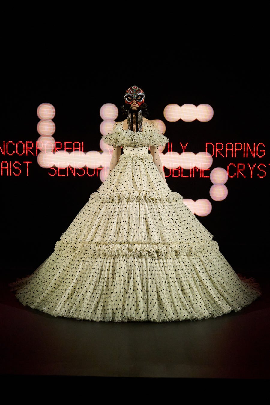 私にとって初めてとなるオートクチュールショーの準備期間中、これらの考えが常に私を支えてくれました。そしてそれらは途切れることのない、潜在的に無限にある言葉のカタログとして、ユニークで限りある、つまり蓄積と並置によって進む非文法的なリストとして、ふたつとないドレスを想像するよう私を促しました。48 のドレス、48 のリスト。それぞれのリストには、測定可能な比率、感情的な糸、絵画的な参照、商品メモ、伝記のようなキルト、映画のような織物、色彩的な配置、哲学的なステッチ、音楽的な印、象徴的な縦糸、言語的な刺繍、植物の断片、視覚的な原型、歴史的なファブリック、物語風のインターシャ、関係性のある結び目など、それぞれのリストには物質的な要素と非物質的な要素が共存しています。