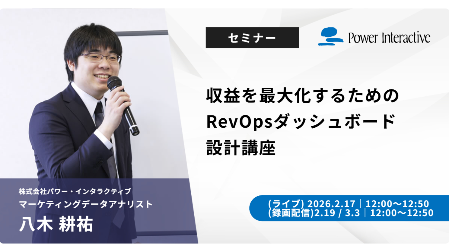 株式会社パワー・インタラクティブは、無料ウェビナー『収益を最大化するためのRevOpsダッシュボード設計講座』を、2月17日にライブ開催、2月19日、3月3日に録画配信を行います。