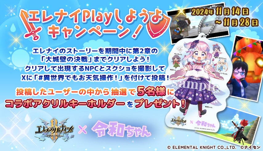株式会社ウインライトは、本格MMORPG『エレメンタルナイツオンラインR』で、11月14日メンテナンス後より、「令和ちゃん」とのコラボイベントを開催いたします。イベントでは、特設マップや防衛戦に移動しイベントモンスターを倒して手に入れたアイテムを合成する事によって、イベント限定の「おしゃれ装備」など、ここでしか獲得できない各種報酬がGETできます。