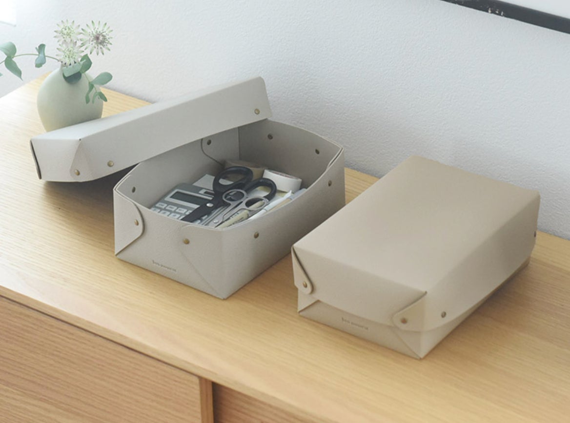 細々としたものを目隠しできる、蓋付きの収納ボックス。フェイクレザー素材に高級感が漂い、空間をすっきり美しく見せてくれます。