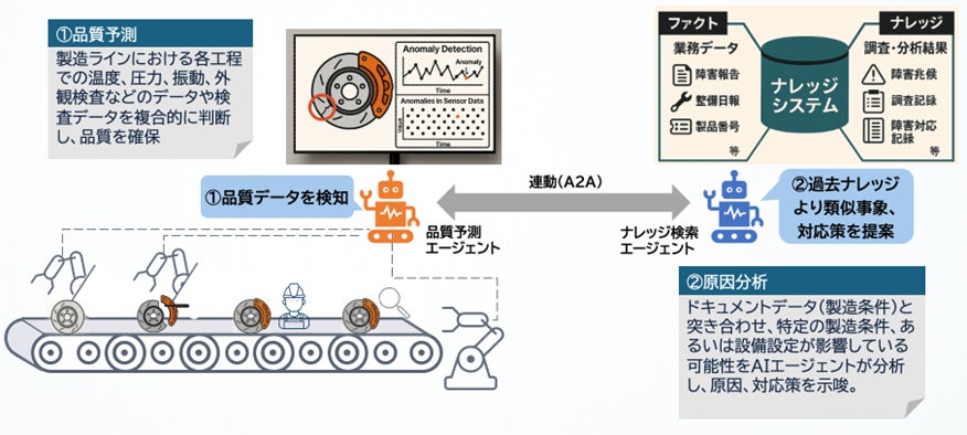 今回の共同研究は、トヨタ車体の熟練技能者のノウハウを、画像・動画・センサー数値・記録文書など多様なデータを扱うマルチモーダル対応のAIエージェントに組み込むことを目的とした取り組みです。トヨタ車体が提供する作業記録、製造ラインで取得する温度・圧力・振動などの数値データ、外観検査で撮影した画像や動画、過去の履歴や製造条件など、多様な情報を組み合わせ、CTCが、製品の品質予測と熟練技能者の技能を分析するAIエージェントのプロトタイプを開発します。2つのAIエージェントが互いに情報をやり取りしながら連動することで、より精度の高い判断を行う「A2A(Agent to Agent)」と呼ばれる方式を採用し、熟練技能者のノウハウを再現し、高度な品質管理の仕組みの構築を目指します。開発の一部は、AIソリューションの開発に強みを持つ株式会社ヘッドウォータースとグループ会社であるDATA IMPACT JOINT STOCK COMPANY社(ベトナム)と連携し、高い技術力とコスト競争力の両面で効率を高めます。