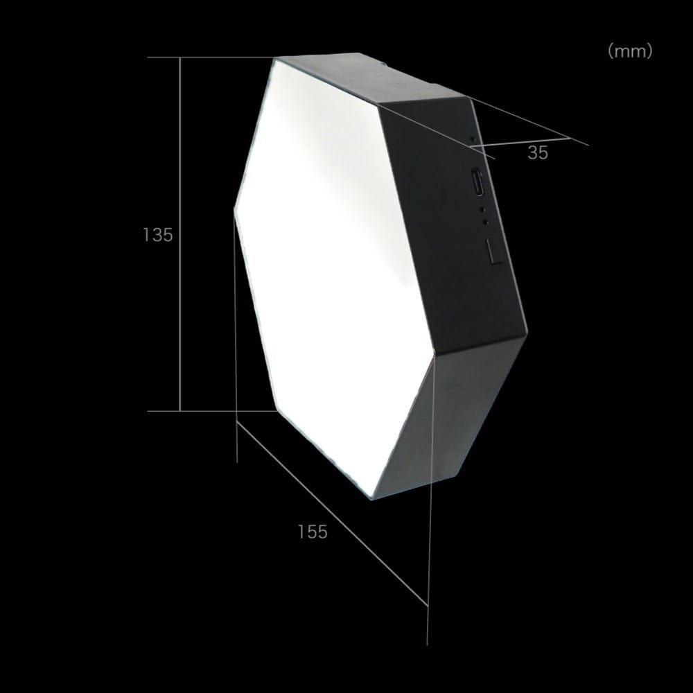 六角形デザインで、幅15.5×奥行3.5×高さ13.5cm、重さ約170g。 USB充電式。