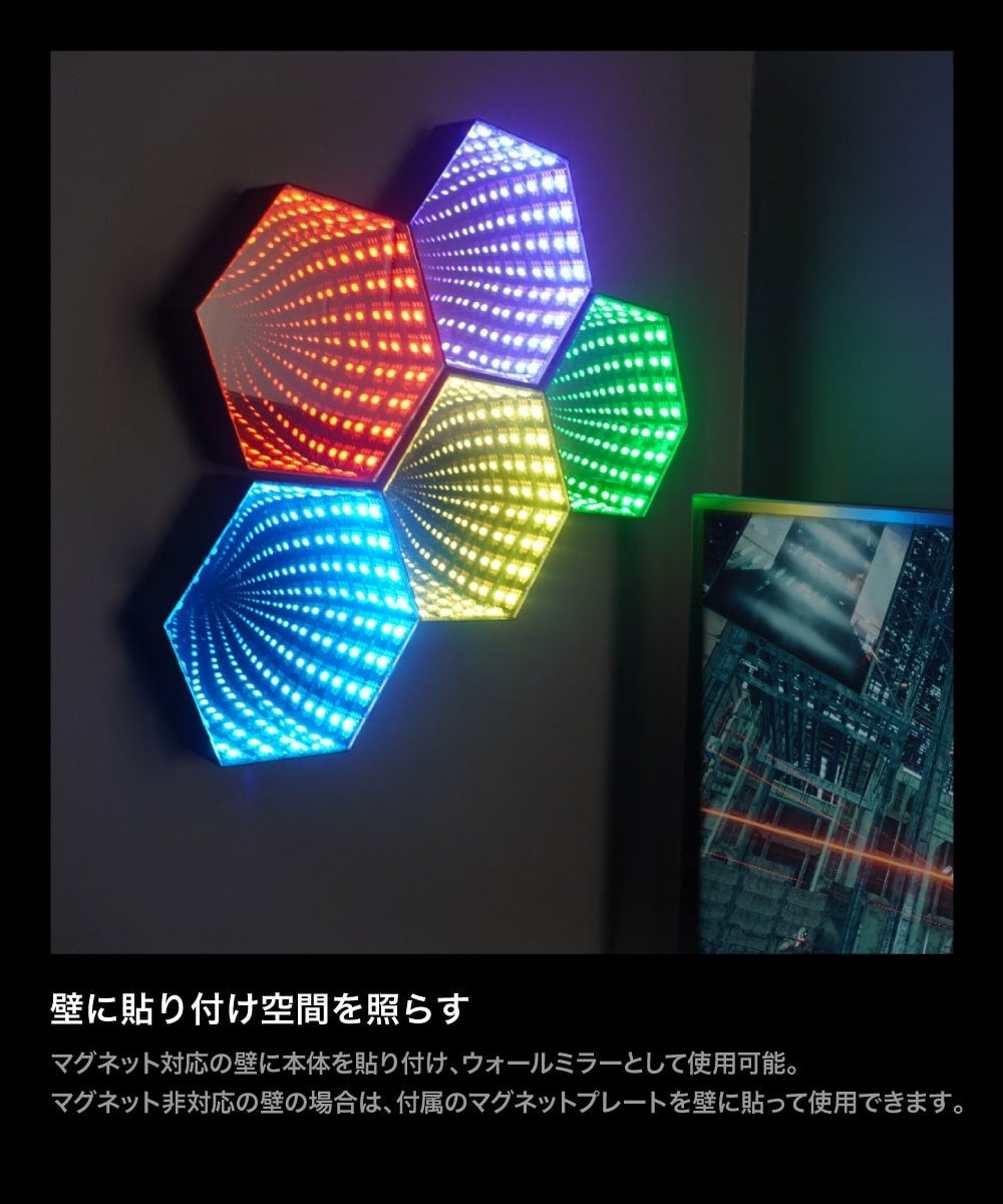 24個のLEDライトを搭載。本体のボタン及びリモコンで操作可能。ボタンを押すと計11色のカラーで点灯が可能。様々なパターンに点灯する36種類のRGBモード。周囲の音を感知して点灯する6種類の音楽モードを搭載。点灯速度や光の強弱もリモコンで調整可能です。