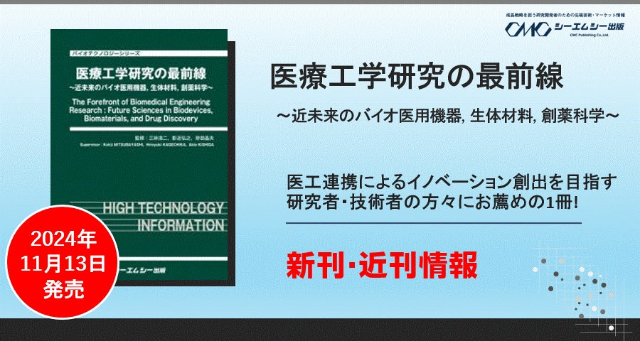 株式会社シーエムシー出版(本社:東京都千代田区神田錦町1-17-1、代表取締役:金森洋平)は、早期診断、高度治療、健康寿命の延伸、創薬ターゲットの探索など、ますます高度化されている医療工学についてまとめた書籍『医療工学研究の最前線(監修:三林浩二、影近弘之、岸田晶夫(東京科学大学 [旧TMDU]))』(定価:税込77,000円)を、2024年11月13日に発売いたします。本書籍は、当社ECサイトおよび全国の書店にてご購入いただけます。
