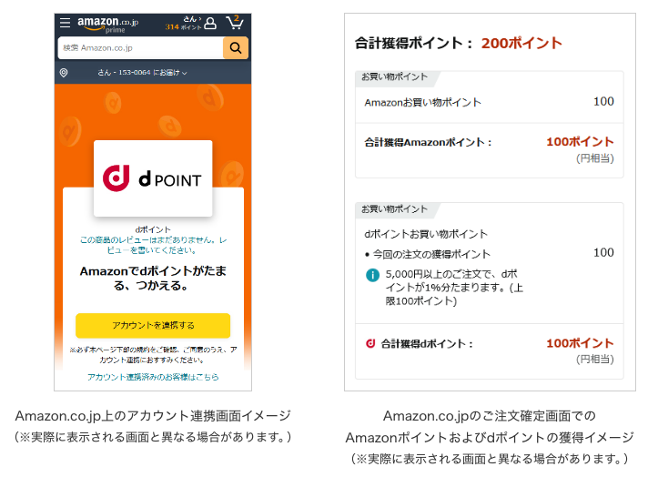 また、対象のお買物で、お持ちのdポイントをつかう(※4)ことができ、dポイントとAmazonポイントの両方を同時につかう※5こともできます。そして、対象のお買物でdポイントやAmazonポイントをご利用いただいた場合でも、dポイントとAmazonポイントの両方がたまるため(※5)、ますますおトクにお買物をお楽しみいただけます。なお、dアカウントとAmazonアカウントの連携は、https://www.amazon.co.jp/dpointで行えます。
