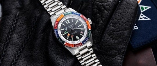 ブランドを代表するモデルが、1960年代に登場した「Skindiver(スキンダイバー)」です。ダイバーズウォッチとしての機能性を備えながら、パイロットウォッチの要素を取り入れた高い視認性のダイヤルデザインが特徴。シンプルでありながら計算されたインデックス配置やコントラストの効いた配色は、水中・陸上を問わず瞬時に時刻を読み取ることを可能にしています。また、一部モデルにはワールドタイム機能を備えるなど、当時としては先進的な機構を取り入れていた点も特徴のひとつです。用途に応じた実用性を重視する姿勢は、単なるダイバーズウォッチにとどまらない多機能ツールとしての価値を生み出しています。現行モデルでは当時のデザインを忠実に再現しつつ、サファイアクリスタルや現代的な防水性能などを備えることで、日常使いに適したスペックへとアップデートされています。