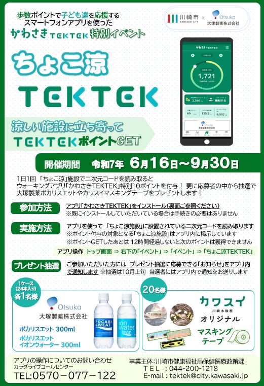 「かわさきちょこ涼(すず)」のうち、イベント対象施設にてアプリで二次元コードを読み取ると、「かわさきTEKTEK」の特別ポイント(10P)が1日1回付与されます。参加者はイベント終了後に大塚製薬「ポカリスエット」等の景品の抽選に応募できます。