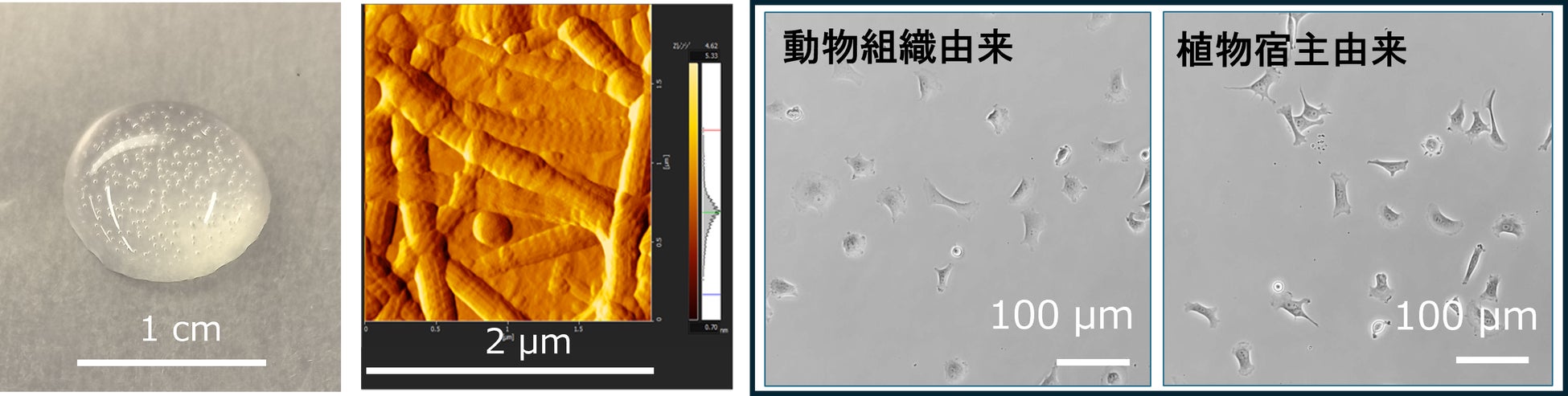 (右)軟骨細胞の接着実験。植物宿主由来のコラーゲンも動物組織由来コラーゲンと