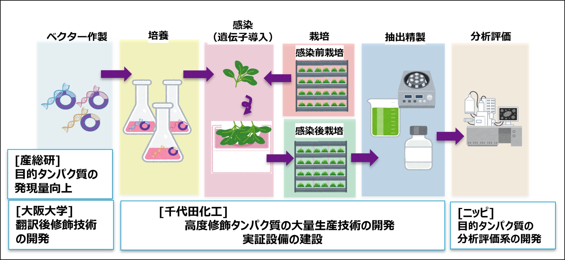 このような背景の下、NEDOは2020年度から本事業※1を実施しており、その一環として2022年度から千代田化工建設は、株式会社ニッピ、国立研究開発法人産業技術総合研究所、国立大学法人大阪大学生物工学国際交流センターと共同で、「植物による高度修飾タンパク質の大量生産技術の開発」(以下、本開発)にて世界初の植物によるヒトⅡ型コラーゲンの大量生産技術を実証するとともに、植物によるバイオものづくり分野の実証基盤の構築に取り組んできました。