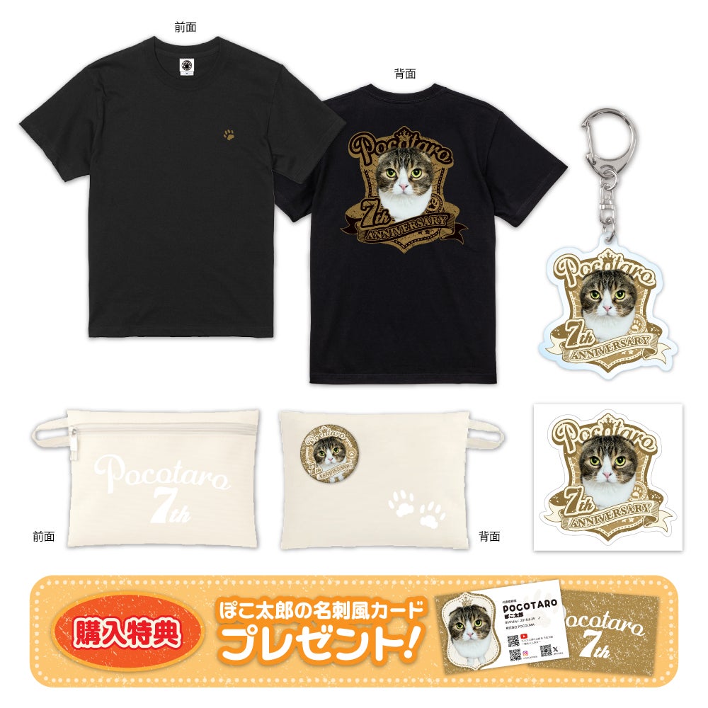 ぽこ太郎7歳記念デザインのアクリルキーホルダー、Tシャツ (ブラック)、ステッカー、ポーチ+缶バッジの4点セット商品です。