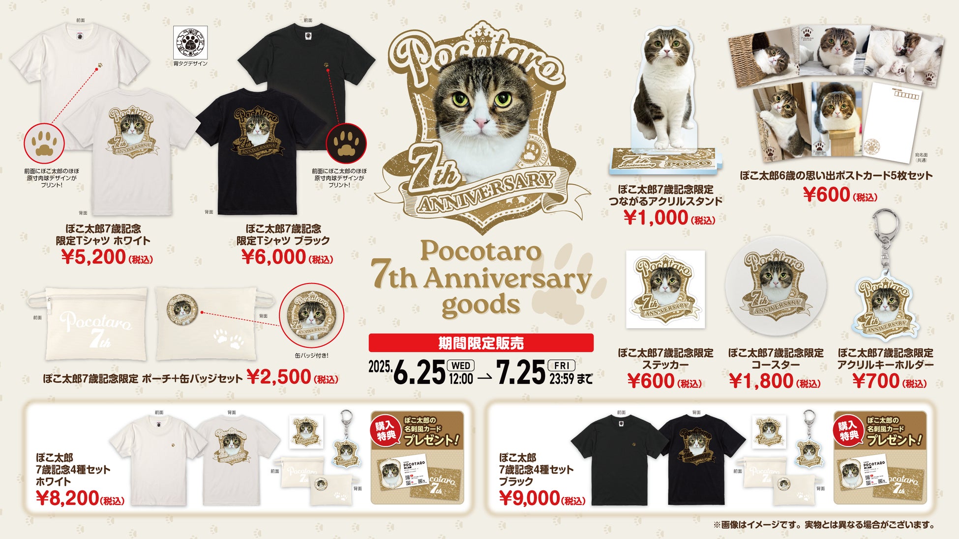 本ストアでは、ぽこ太郎の7歳を記念したオリジナルグッズ全10種を期間限定で販売。アクリルスタンドや缶バッジ、Tシャツ、ポーチなど、ファンにはたまらないラインナップとなっております。