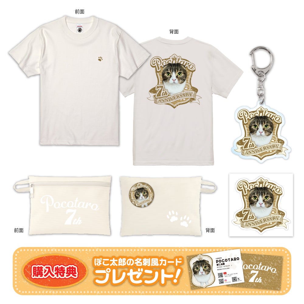 ぽこ太郎7歳記念デザインのアクリルキーホルダー、Tシャツ(ホワイト)、ステッカー、ポーチ+缶バッジの4点セット商品です。