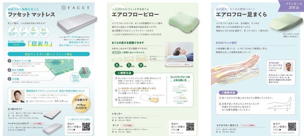 コラボレーションとして導入される寝具は、寝返りから睡眠を変える「ファセットマットレス」、 高さを調整できる「エアロフローピロー」。そして、足の疲れとむくみをリセットする「エアロフロー 足まくら」の全3商品となります。