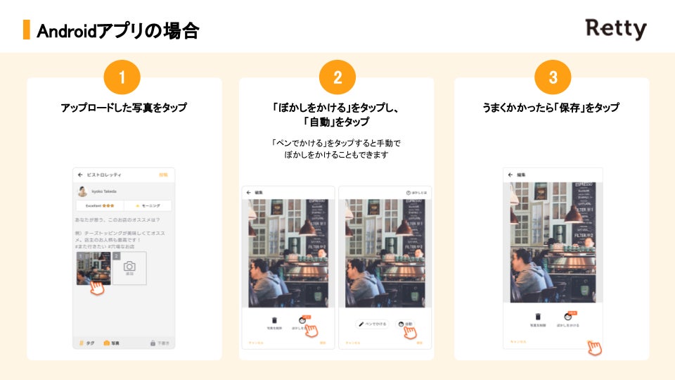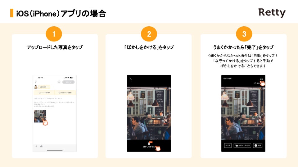 これによって、お店をオススメしたいユーザーは内観写真を気軽に投稿できるようになり、お店探しをするユーザーはよりリアルな雰囲気を知りお店探しに役立てられるようになります。ぼかし機能は本日よりRettyのiOS・Androidアプリで利用できます。今後もRettyはユーザーの声をもとにお店探し体験をよりよくするための改善を続けます。