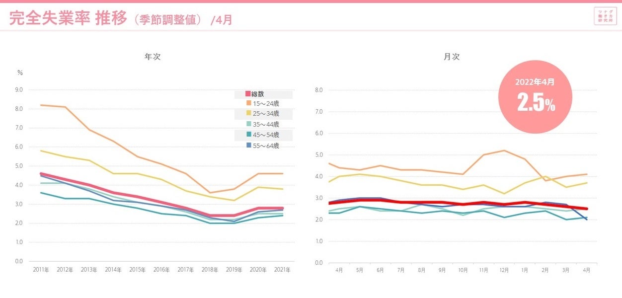 多様な働き方の調査研究機関「ツナグ働き方研究所(拠点:東京都千代田区/所長:平賀充記)」は、官公庁などが発表する労働市場関連のデータをキュレーションしつつ、分かりやすくまとめた「労働市場データレポート」を毎月発表していきます。今回は5月下旬に発表された最新データをもとに2022年4月度レポートについて、とりまとめましたのでご報告いたします。