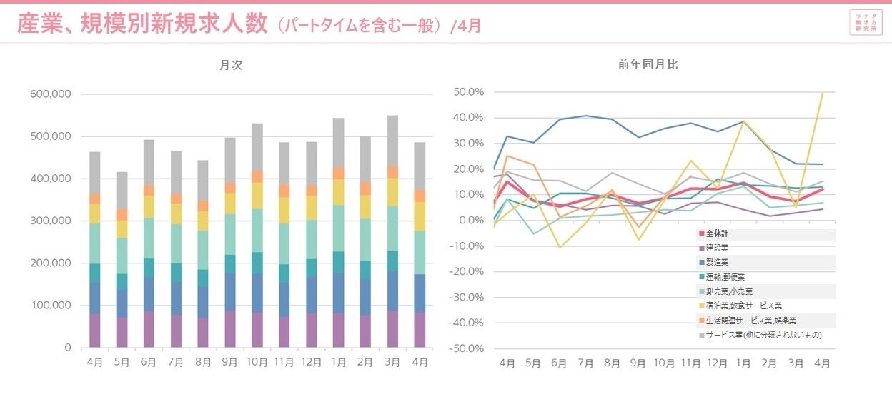 新規求人数は、前年比で12.3%増とやや改善しました。特に宿泊業,飲食サービス業は改善が著しく(49.6%増)、製造業(21.9%増)、サービス業(他に分類されないもの)(15.3%増)が伸び率トップ3となりました。