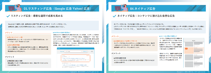 Web広告と一口に言ってもその種類はさまざまです。広告を表示できる媒体や、その広告で効果を実感しやすい商材など、特徴は異なります。数ある広告のメリットやデメリットなどを把握しておくことで、自社に最も適した広告を選択できるようになります。