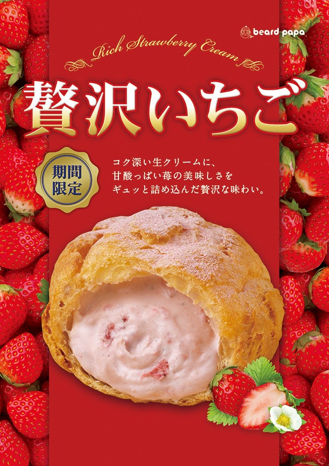 株式会社 麦の穂(本社:大阪府大阪市北区、代表取締役:杉内 健吉)は、2022年1月1日(土)よりシュークリーム専門店「ビアードパパ」にて毎年大人気の“贅沢いちご”を販売いたします。加えて2022年1月6日(木)からは新作の“バスクチーズケーキシュー”も登場いたします。