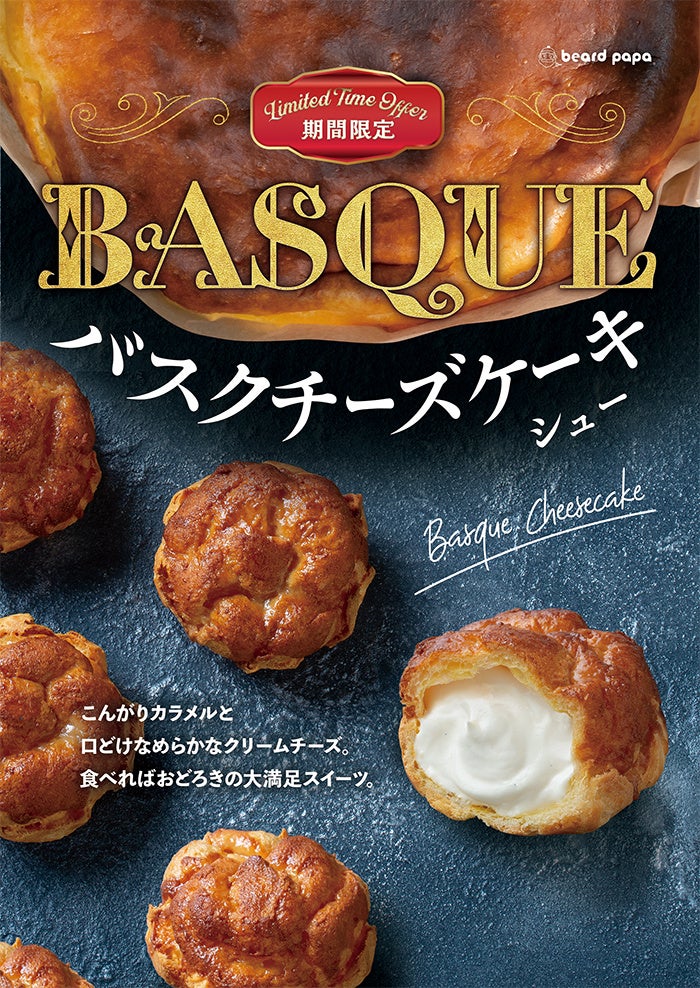 “バスクチーズケーキシュー”は焼き焦がしたカラメルの香ばしさが特徴のバスクチーズケーキをシュークリームにアレンジ。こんがり二度焼きのカラメル生地と濃厚でなめらかなチーズクリームを合わせたビアードパパ自信の新作です。