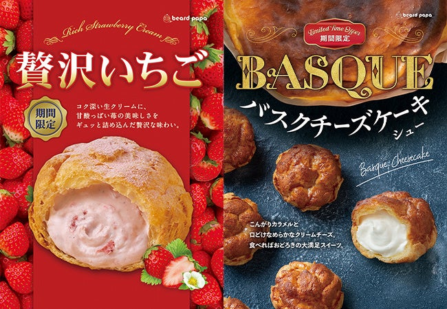 苺の美味しさをギュッ!シュークリーム専門店ビアードパパの2022年は大人気“贅沢いちご”でスタート。 1月6日からはバスクチーズケーキをアレンジした新作シューも登場!