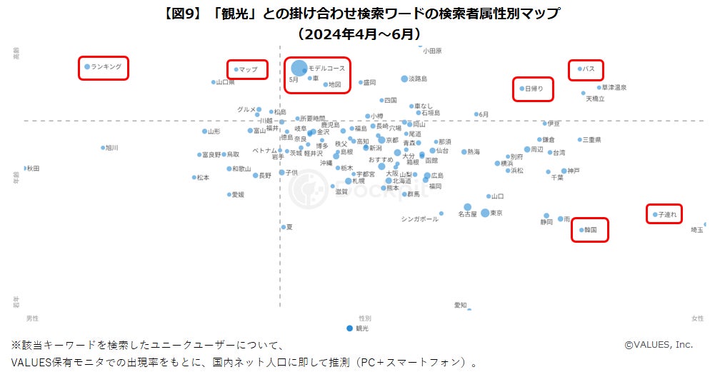 最後に、消費者のオンライン上の行動ログデータを使用して、「観光」と掛け合わせて検索されたワードの、検索者属性別マップ(縦軸:年齢、横軸:性別)を作成しました。マップを見ると、中高年男性では「ランキング」が、中高年女性では「日帰り」「バス」がよく検索されていることがわかります。中高年層では「マップ」「地図」「モデルコース」「車」なども「観光」とよく掛け合わせられており、ドライブ需要の高さや、自分でこだわりをもって行き先を調べるよりも、モデルコースに準じて旅行したいといった需要がうかがえます。一方、若年女性では「韓国」「子連れ」といったワードが特徴的であり、韓国美容やK-POPに対する関心の高さや、子連れでも楽しめる旅行へのニーズが見て取れます。