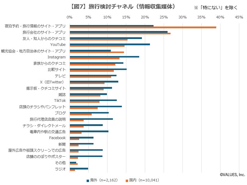 海外旅行は国内旅行に比べ、現地での臨機応変な判断が難しく、諸々の勝手がイメージしにくい上に予算感が上がるため、「ちゃんと準備しておきたい」「失敗したくない」という思いが強くなりやすいと考えられます。その点で、SNSやブログなどの口コミでしっかり情報収集しておきたいという人が多いのではないでしょうか。また様々な旅行先が選択肢としてある中で、広告で受動的に得た情報をきっかけに旅行先が決まっていくことも、国内旅行の場合より多いのかもしれません。