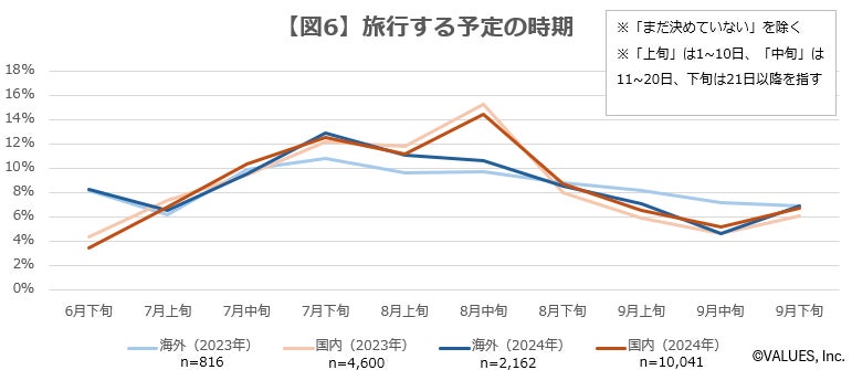 同様に、旅行する予定の時期についても聴取しました。こちらも国内旅行については2023年、2024年で大きな違いはなく、8月中旬がピークになっています。一方海外の場合は7月下旬がピークとなっており、2024年は昨年よりもさらに数ポイント高くなっています。こちらも、先述した今年7月末から開催のスポーツイベントが関係している可能性が高いと考えられます。