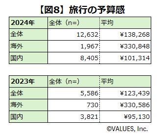 旅行の予算感については、2023年は平均約12.3万円だったのに対し、2024年は平均約13.8万円と、昨年から1.5万円ほど増額しています。内訳を見ると、海外旅行については大きな変化はないものの、国内旅行で5,000円ほど増加しています。「円安で海外は難しいが、その分国内旅行で少し奮発したい」という心理もあるのかもしれません。