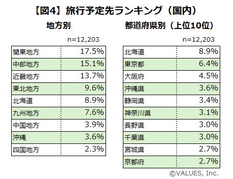 国内について地方別で見ると、関東地方が17.5%で1位、中部地方が15.1%で2位、近畿地方が13.7%で3位となりました。都道府県別では、1位から北海道(8.9%)、東京都(6.4%)、大阪府(4.5%)、沖縄県(3.6%)、静岡県(3.4%)となっており、人気の観光地である京都府が10位に来ていることが印象的です。円安でインバウンドが活発化し、混雑が予想されることから、この夏は京都を回避する動きがあるのかもしれません。