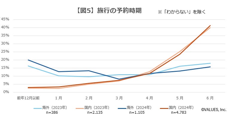 次に、夏の旅行を予約した時期を集計し、2023年と2024年、国内と海外で比較しました。国内については2年間で大きな変化は見られず、いずれも6月が約40%とピークになっています。対して海外旅行では、前年12月以前~2月に予約したという人の割合が、昨年の36.4%に対して今年は46.4%と、半年ほど前から予約しておく傾向が強いようです。背景としては、2024年夏の世界的スポーツイベント開催に向けて、早めに準備している人が多いことが考えられます。