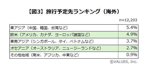 旅行を予定・検討している人に対し、直近の旅行先を聴取し、海外・国内それぞれでランキング化しました。海外の旅行先としては中国や韓国をはじめとした東アジアが1位、僅差で欧米が続いています。