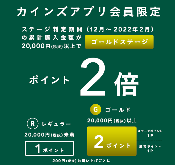 「ステップアップサービス」は、カインズ店舗でのお買い物によって得られるポイントが2倍にアップする、アプリ会員限定の新しいサービスです。ステージ判定期間(3カ月)ごとのお買物累計金額が2万円(税抜)以上で、次の期間(3カ月)はゴールドステージ会員となり、ポイントが2倍になります。