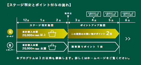・ゴールドステージでは、200円(税抜)ごとに付与されるお買物ポイントが2倍になります。