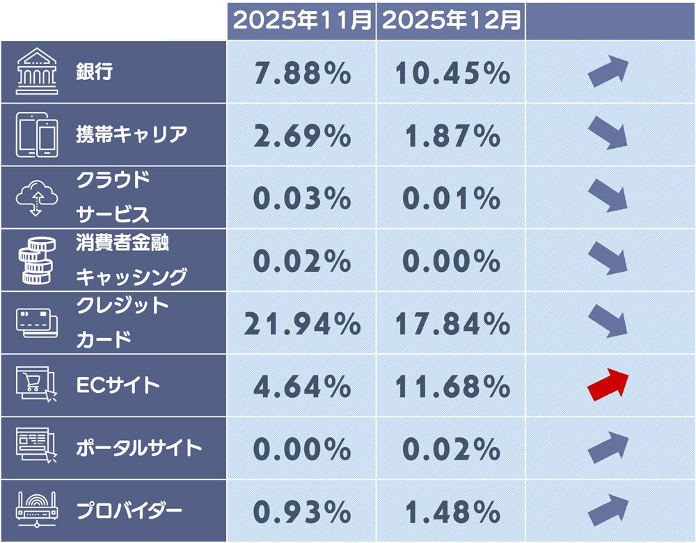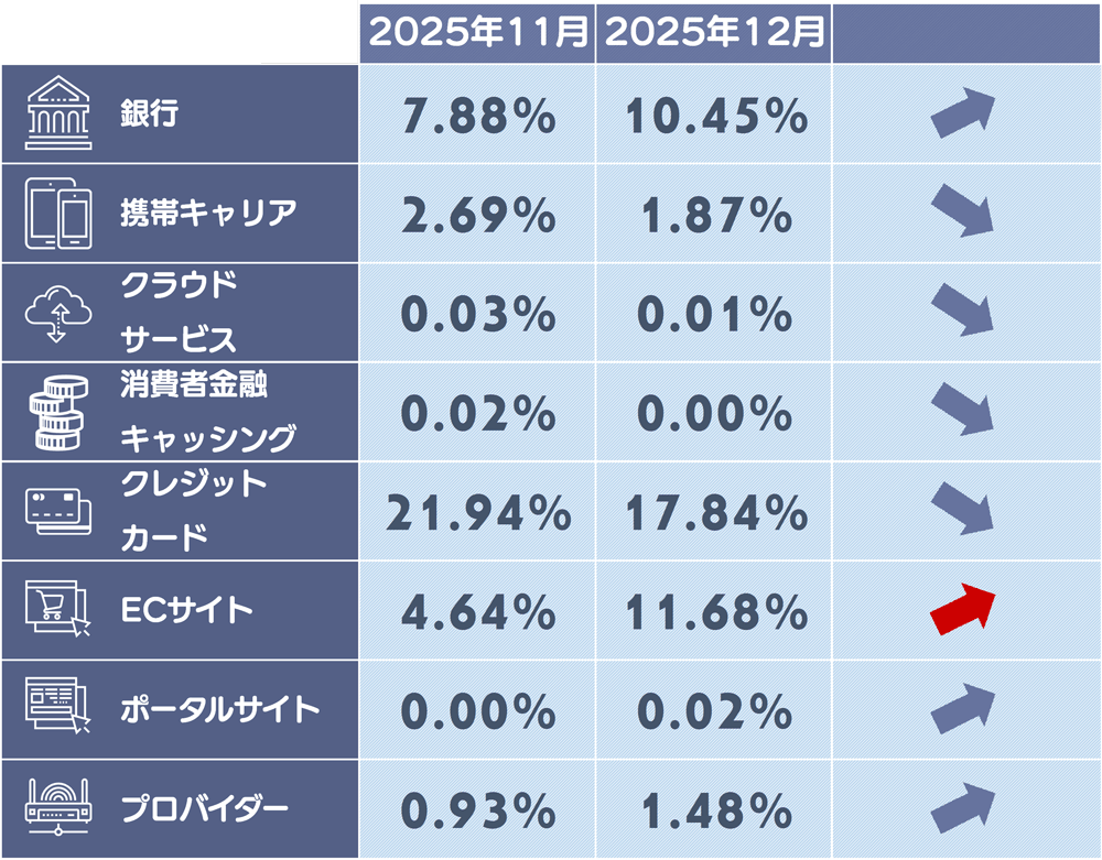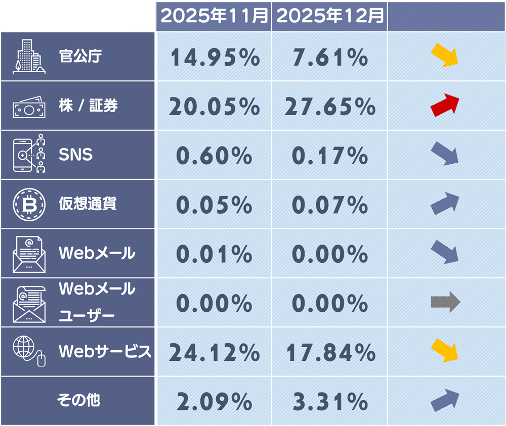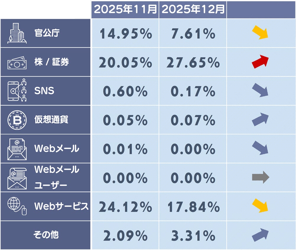 12月度は証券系、EC系のフィッシングサイトの構成比が上昇しています。Amazonやマネックス証券のフィッシングサイトが増加したことが起因しています。