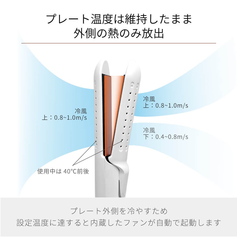 プレート外側を冷やすため、設定温度に達すると内蔵したファンが自動で起動。送風口から最大1.0m/sの風を送り、熱を放出します。