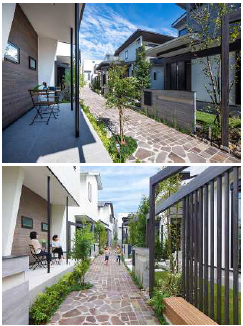 街区を縦断する敷地境界を、互いの敷地の一部を拠出し合うことで一次元的な「線」ではなく二・三次元的な「空間」として再構成した「路地のある分譲住宅」です。その街の骨格となる路地を介し、各戸の玄関へのアクセスや住民同士の交流、緑道化による景観形成、建物の裏側の解消と敷地の未利用地化の回避など、全戸が相互に関わり豊かな住環境を形成することを願った街づくりです。