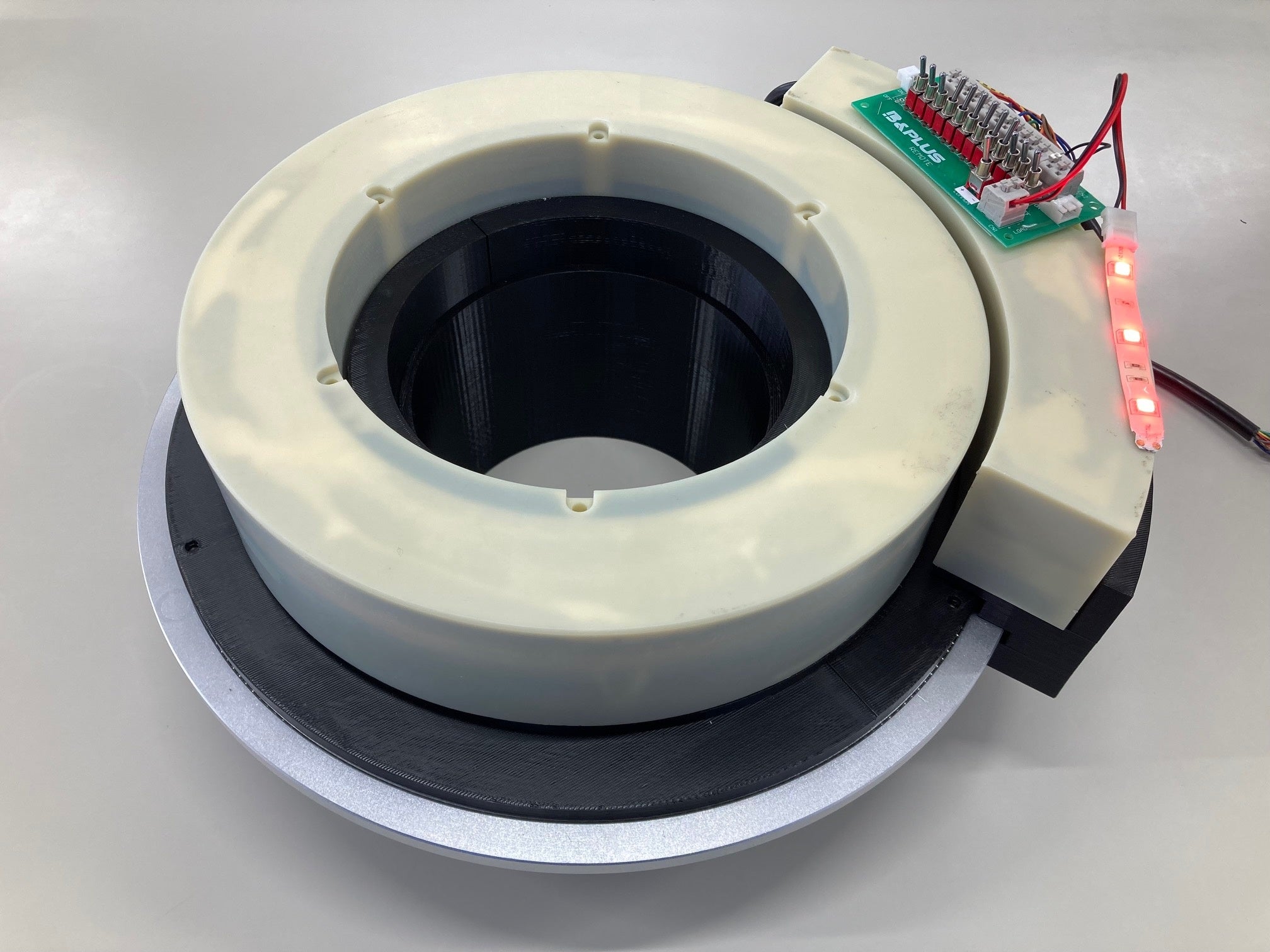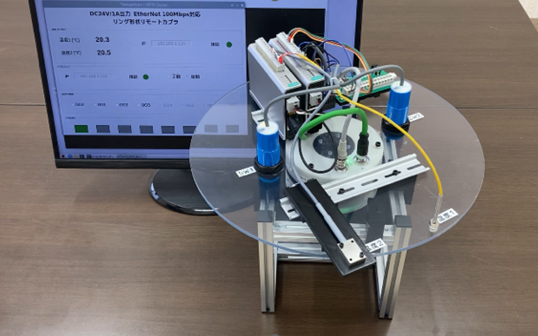 インデックステーブルやロボットなどの回転部向けで、新開発中のリング形状新デモ機も展示。回転中も常に「ワイヤレス給電+Ethernet通信」が可能となるため、熱電対やI/Oセンサを搭載し回転中の数値変化が確認出来る仕様となっている。