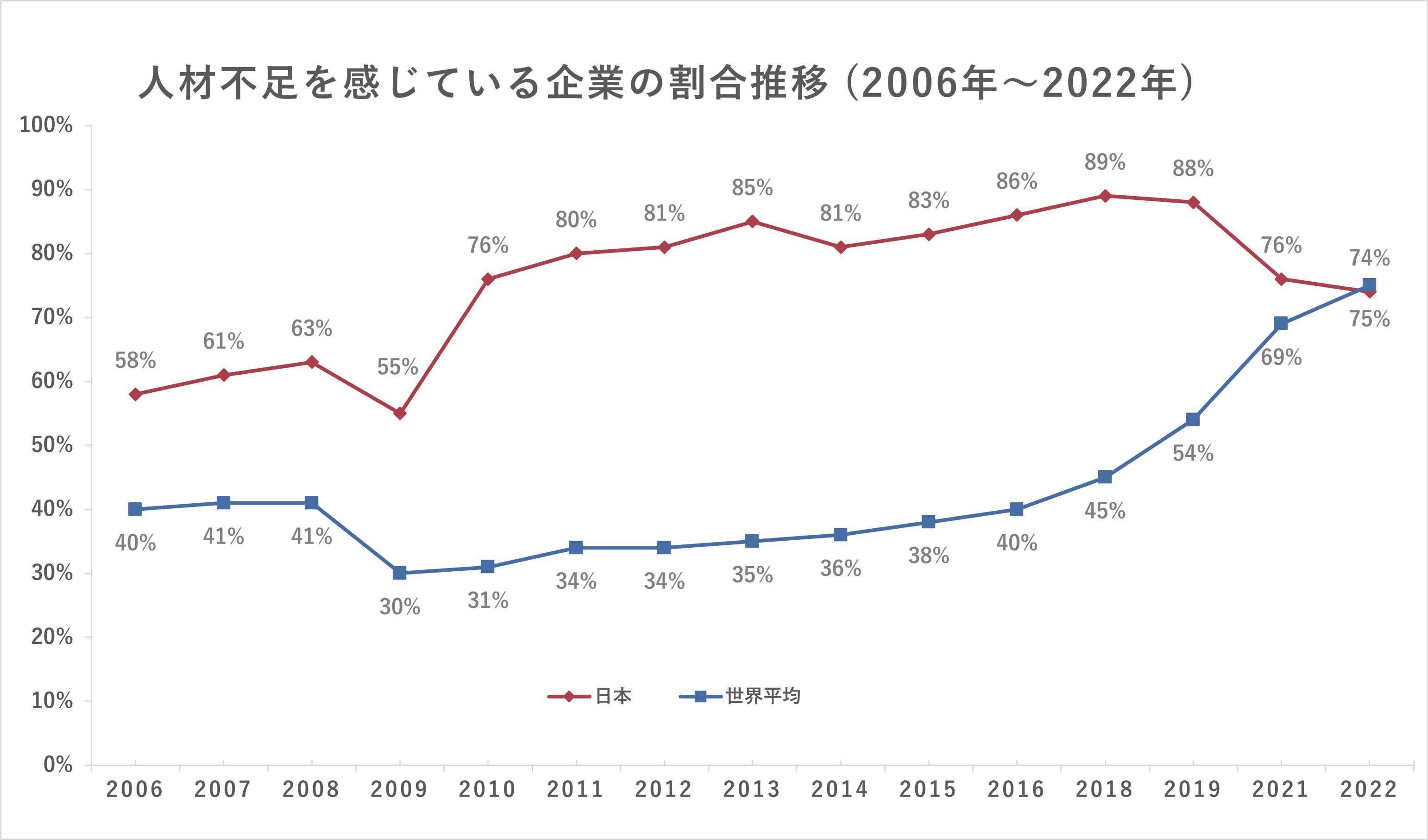 世界で人材不足を感じている雇用主は、前年比6パーセントを上回る75%、日本では、前年比2%ダウンの74%となりました。調査開始以降初めて、日本の人材不足感が世界平均を下回っています。(図5参照)