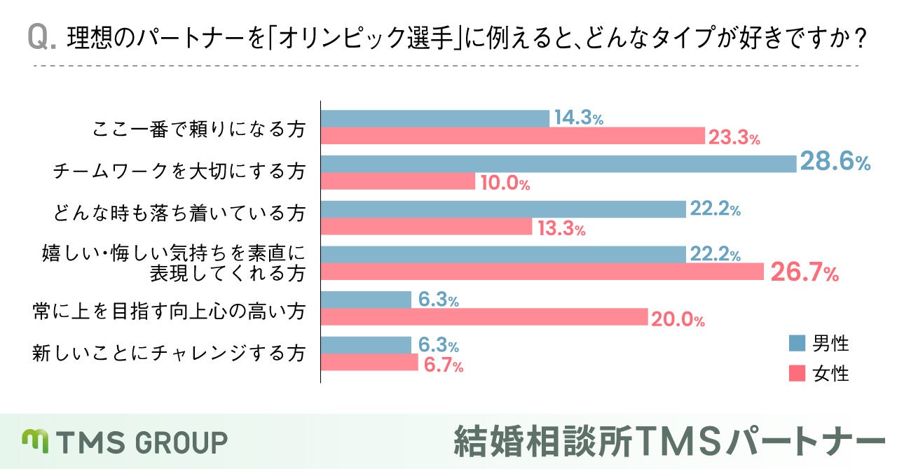 ・理想のパートナーを「オリンピック選手」に例えると、女性は感情を素直に伝えてくれる方、男性は協力し合える関係性を望んでいる