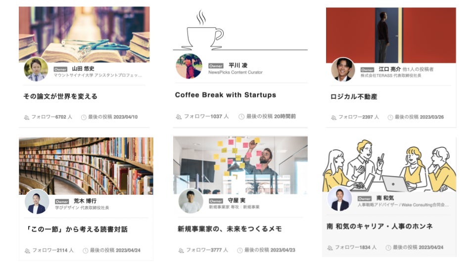 2023年4月現在のトピックス数は57、オーナーとモデレーターは96名となり、毎週30本以上の新着投稿があります。オーナーを継続いただいている方からは、NewsPicksの強みである、経済への関心が高い読者との出会いが支持されています。