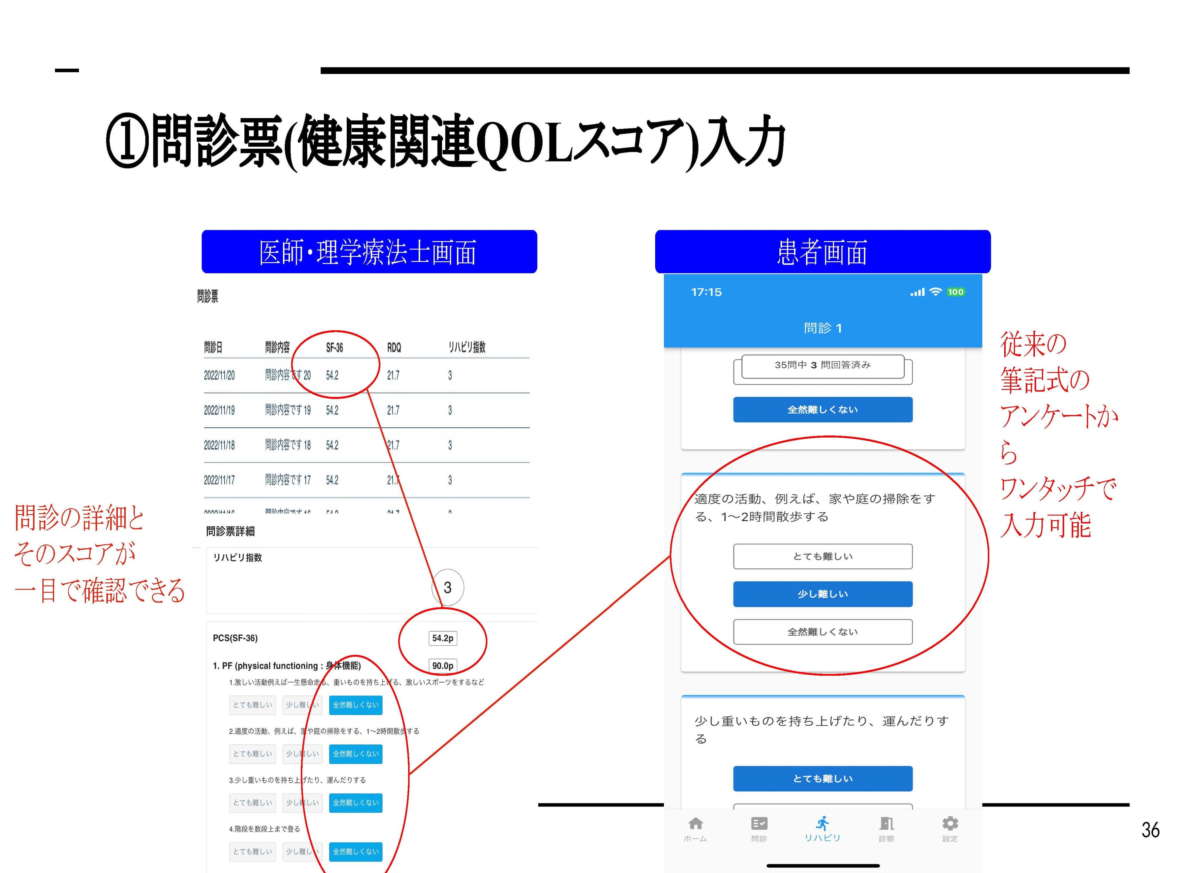 同社は、福島県立医科大学会津医療センターとの共同研究をしています。同社のアプリは現在、脊椎手術術後リハビリに対応するプログラムとなっていますが、今後、股関節や膝関節等の術後リハビリに対応するプログラムを開発していきます。更に同社は、これを保険適用させることで、患者及び医療機関の双方にメリットを提供することを目指しています。
