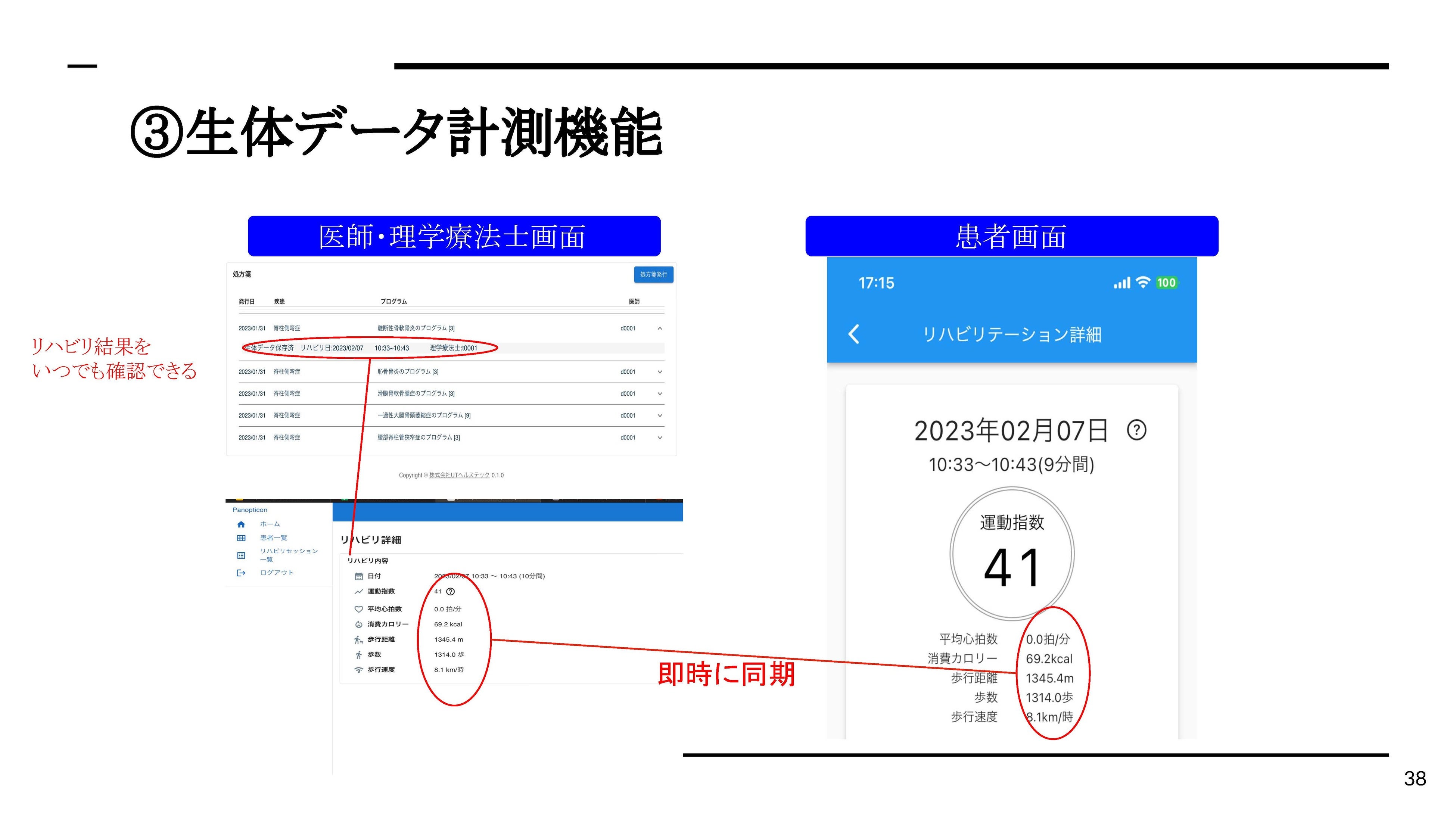 同社の開発した「Panopticon」は、アンケート機能とビデオ通話とウェアラブルデバイスを組み合わせたソフトウェアです。患者は、スマートフォンに表示される問診票に今の自身の状態を入力、ウェアラブルデバイスを装着し、アプリ内で医師とビデオ通話しながらリハビリを行います。これにより、自宅でも医療機関と同じようにリハビリを行うことができ、患者の負担を軽減します。医師は、ウェアラブルデバイスによる患者の生体データの確認、更に同社が特許を取得している自動処方プログラムにより、患者管理の負担を軽減することが可能となっています。