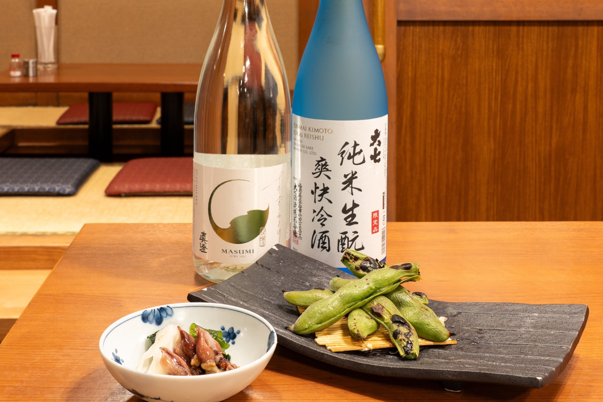 「真澄 純米吟醸 すずみさけ」は、ほのかな酸味と軽快で爽やかな口当たりが特徴。夏の高原の吹き抜ける風のような透明感のある夏酒で、「焼きそら豆」や「ほたるいか酢味噌」といった、素材そのものがもつ風味を楽しむ料理を引き立たせます。
