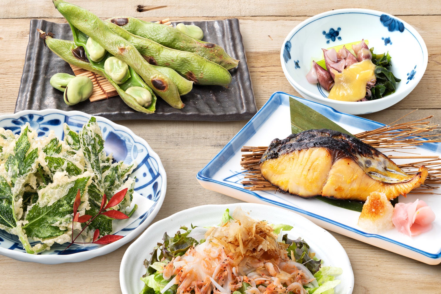 「初夏を感じる厳選メニュー」として、そら豆や明日葉、桜海老など旬の食材を使った全11品を用意しました。いずれのメニューも、手づくりの味を大切にする『庄や』ならではの自慢の品々です。また、今回の「旬メニュー」より、新たに季節の日本酒の提供を開始します。5月・6月は初夏の味覚がいっそう楽しめる夏酒2種を用意。旨いつまみと旨い酒で季節の移ろいを楽しんでみてはいかがでしょうか。