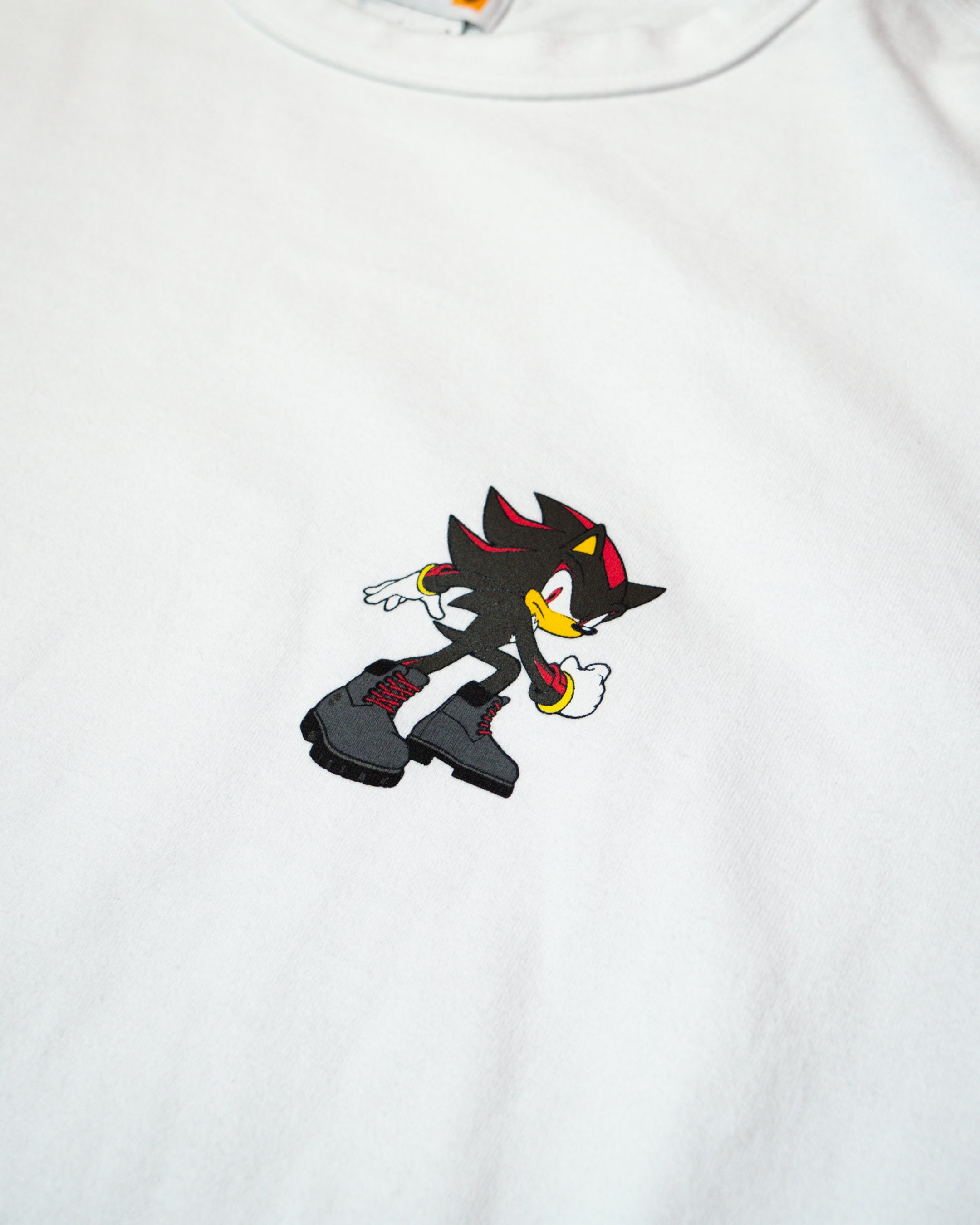 “6インチブーツ”は、特別仕様のシャドウをヒール横とハングタグに刻印し、シューレースはシャドウを彷彿とさせるレッドにアップデートすることで、遊び心と存在感を兼ね備えた1足となっています。長袖Tシャツは、特別仕様のシャドウを左胸にワンポイントであしらい、右腕に「ソニック」シリーズのタイトルロゴを、左腕にレッドのティンバーランドロゴをデザイン。一方半袖Tシャツは、特別仕様のシャドウを背面に大胆にプリントし、左胸部分に「ソニックシリーズ」のタイトルロゴとレッドのティンバーランドロゴを配置。どちらもホワイトとブラックの2カラーを用意し、ホワイトは柔らかさと発色性を兼ね備えたハーフラバープリントを採用することでヴィンテージライクな仕上がりとなり、ブラックは全体を起毛させて色を退色させるフロスト加工によりタフに着用されたかのようなフェード感を再現しています。