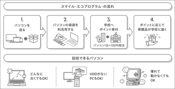 「スマイル・エコ・プログラム」とは、全国エリアを対象とする小型家電リサイクル法 認定事業者リネットジャパンリサイクルが展開する、パソコンリサイクルを通じた寄付の新たな仕組みです。また、レアメタルのリサイクルは都市鉱山問題の解決にもつながるものです。