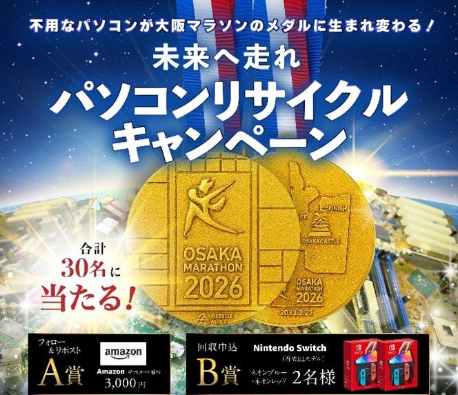 株式会社(本社:愛知県大府市)ならびに一般社団法人地域SDGs創生ネットワーク(東京都港区)は2026年2月22日(月)に開催される「大阪マラソン2026」と連携し、ご家庭で不用になったパソコンを回収し、大阪マラソン2026の金銀銅メダルを作る「#めっちゃええやんメダルプロジェクト」を3年連続で開催中。今年は豪華景品が当たるSNS投稿キャンペーンも実施します。