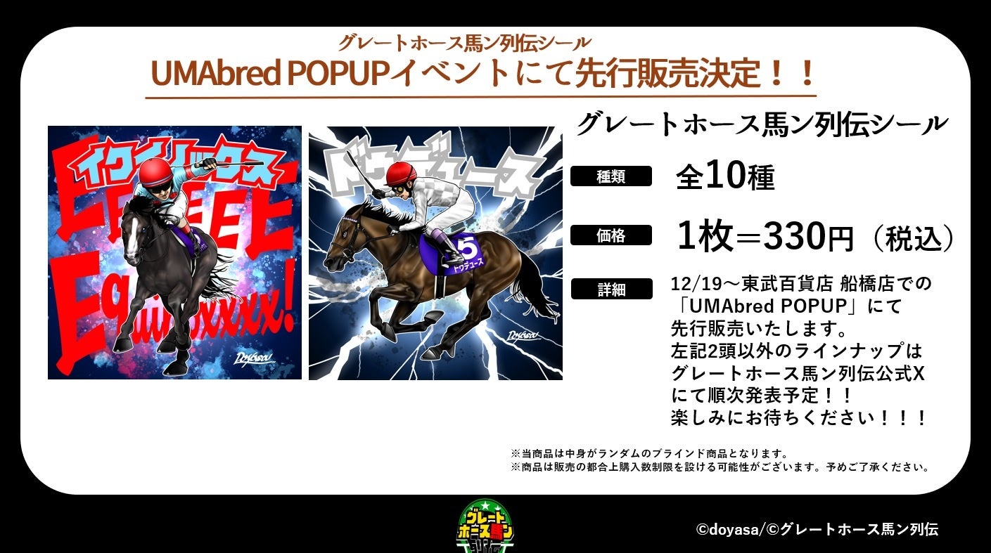 今回は同ブランドの第1弾商品となります「グレートホース馬ン列伝シール」を全国販売に先立ちまして、会場限定にて先行販売させていただきます。