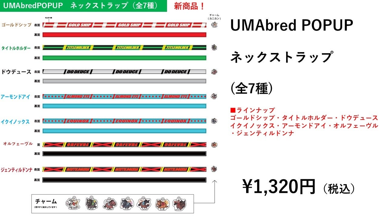 勝負服風デザインとなっており、先端には各UMAのチャームが付属。
