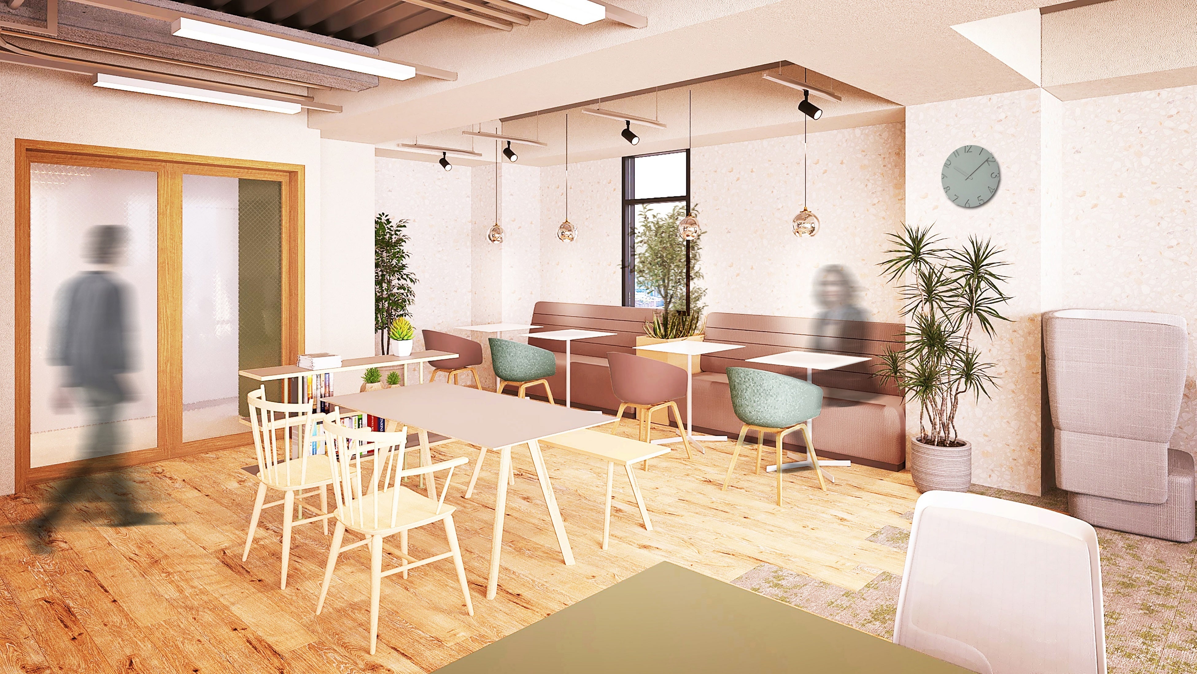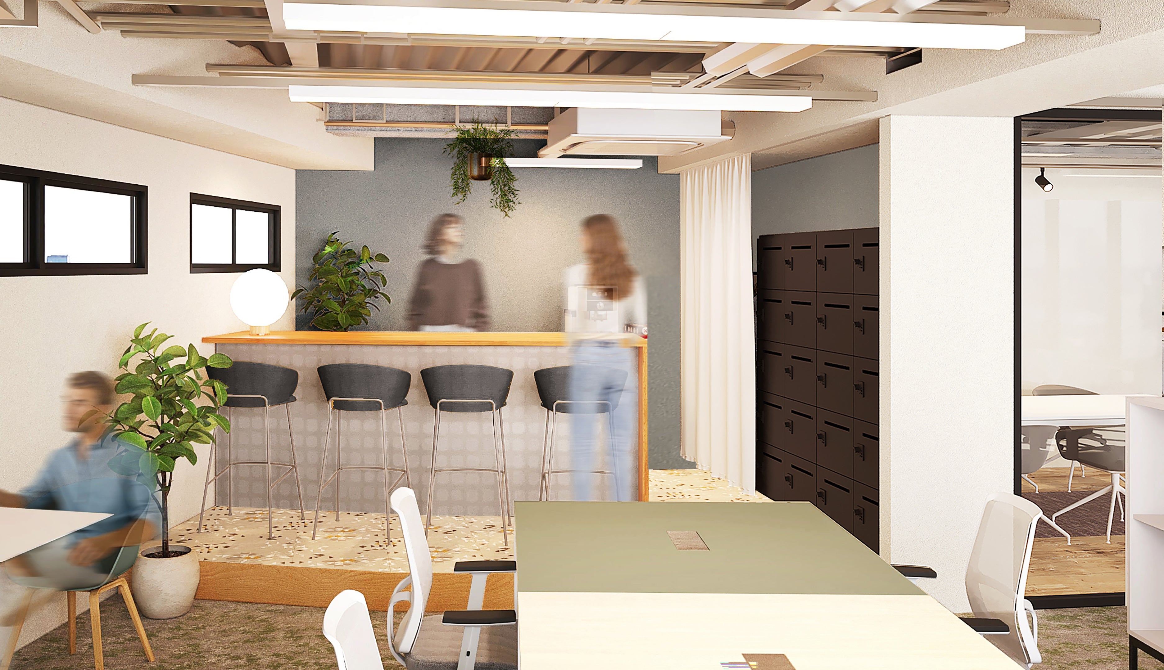 機能面にデザインとアレンジを加え、“暮らすように働く”というイメージで空間を構成。自宅やオフィスではない新たな働く場、感受性が刺激されるサードプレイスとしてふさわしい空間となるよう、木やモルタルの素材感、色使いや照明計画などで空間の質を高めています。